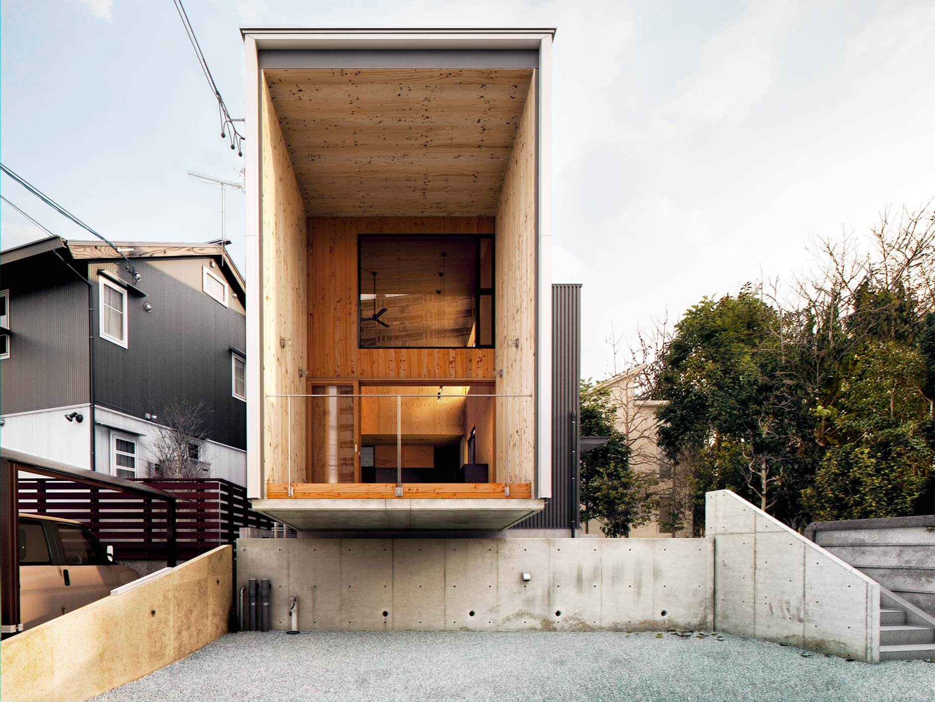 There are three basic materials for covering: wood, metal and ceramic tiles. We had designed this house with panoramic windows, so we only filled it up with functionality.